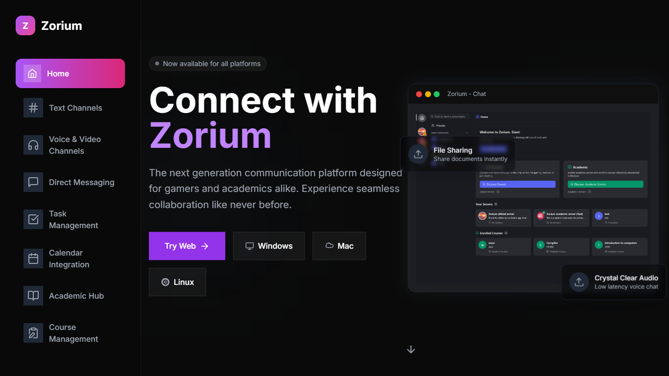 Zorium es una plataforma de comunicación diseñada para jugadores y académicos, que ofrece funciones como chat de voz, intercambio de archivos y gestión de tareas.